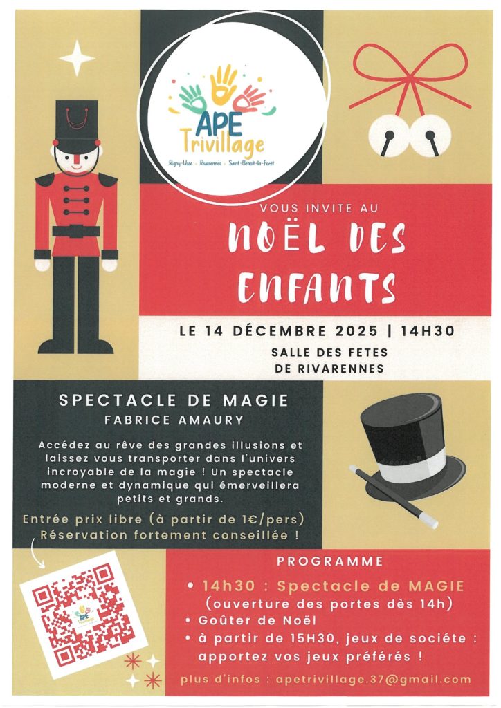 Nous avons le grand plaisir de vous inviter à la première fête de Noël de l’APE, qui aura lieu Dimanche 14 décembre, à la salle des fêtes de Rivarennes.