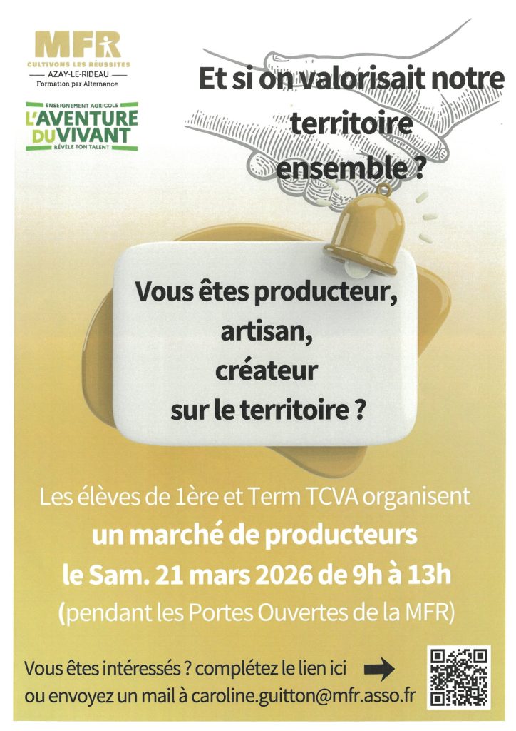 Les élèves de l’option TCVA (Technicien Conseil Vente en Alimentation et boissons) de la MFR d’Azay-le-Rideau organisent un marché de producteurs le Samedi 21 mars 2026 de 9h à 13h (pendant les 2èmes Portes Ouvertes de la MFR)