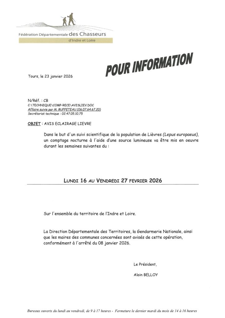 Pour rappel: Tout animal prélevé à l’occasion de ces opérations d’affût approche devra être porteur d’un dispositif de marquage “bouton” et tout prélèvement devra être déclaré auprès des services de la Fédération des Chasseurs d’Indre-et-Loire dans les 72h suivants le prélèvement.