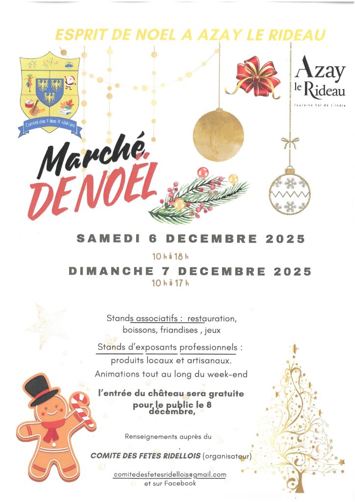 Agenda Le comité des fêtes d’Azay le Rideau organise un marché de Noël le samedi 6 et dimanche 7 décembre dans la cour du château et les rues d’Azay le Rideau.
